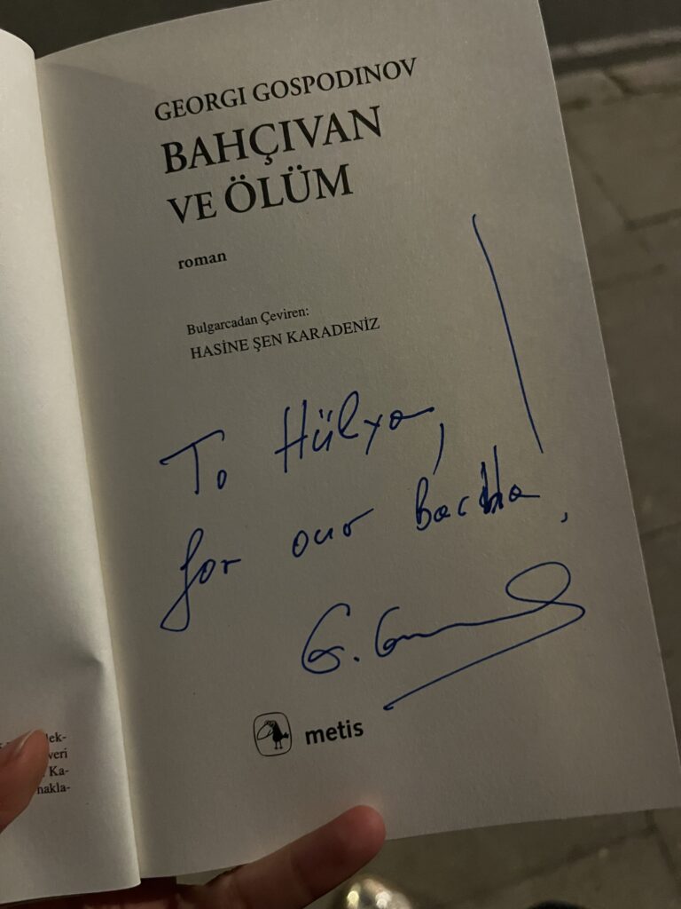 Söyleşinin ardından hepimiz imza sırasına girdik. Ben elimdeki Türkçe edisyonu imzalatmak için uzattığımda Gospodinov Türkiye’den kitaba dair harika şeyler duyduğunu ve çok mutlu olduğunu söyledi. İmzalarken de “Bizdeki ‘bacha’ ile sizdeki ‘bahçe’ aynı” dedi ve ‘Bahçemize!’ diyerek imzaladı.