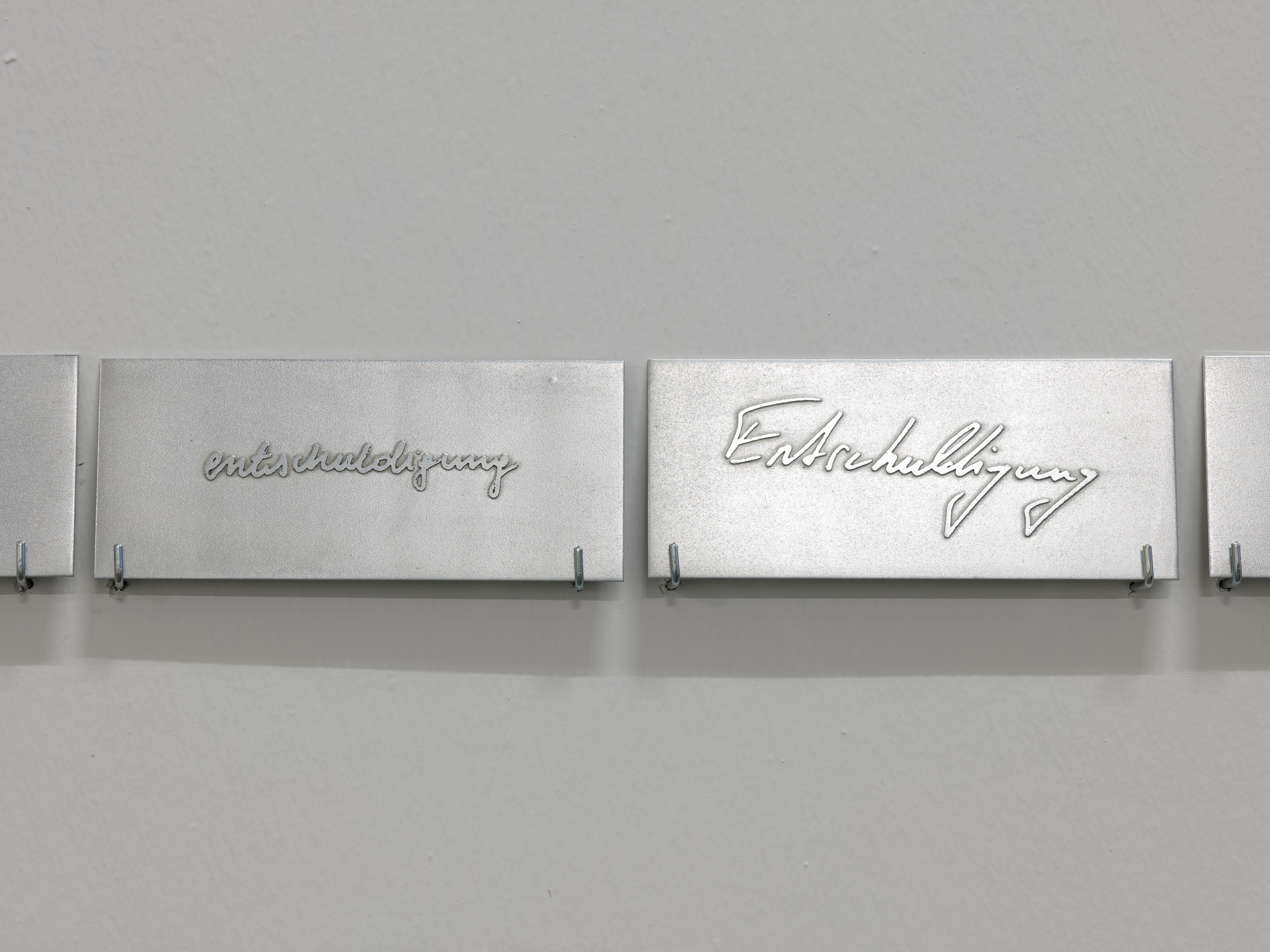 Sergi mekânında karşılaşılan işlerden ‘Entschuldigung’ (Özür dilerim), Zürih adli polis teşkilatına bağlı kişilerin kendi el yazılarıyla tekrar tekrar yazdığı tek bir kelimeden oluşuyor. Kazınmış çinko levhalar, duvar boyunca yan yana dizilerek ilerliyor. İş, özrü telafi edici bir jestten çok, tekrarla aşınan ve etkisini yitiren bir ifade olarak ele alıyor.