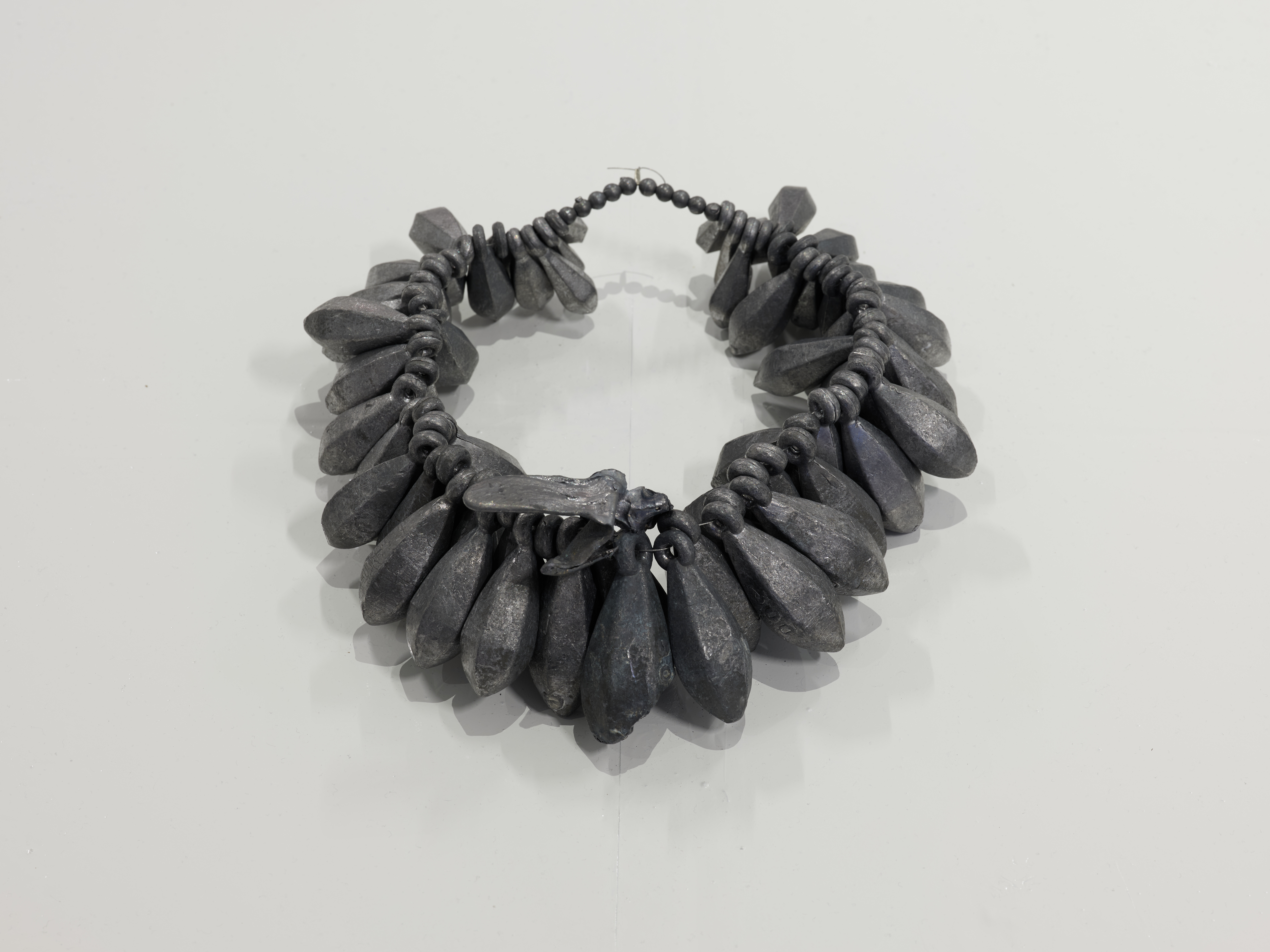 Yeni üretimlerden ‘Hepsi senin iyiliğin için bitanem’ başlıklı kurşun kolye, mekâna adım atar atmaz izleyiciyi karşılıyor. Farklı gramajlarda kurşun ağırlıkların bir araya geldiği iş, aile içi koruma söylemleriyle yük kavramı arasındaki gerilimi somutlaştırıyor.