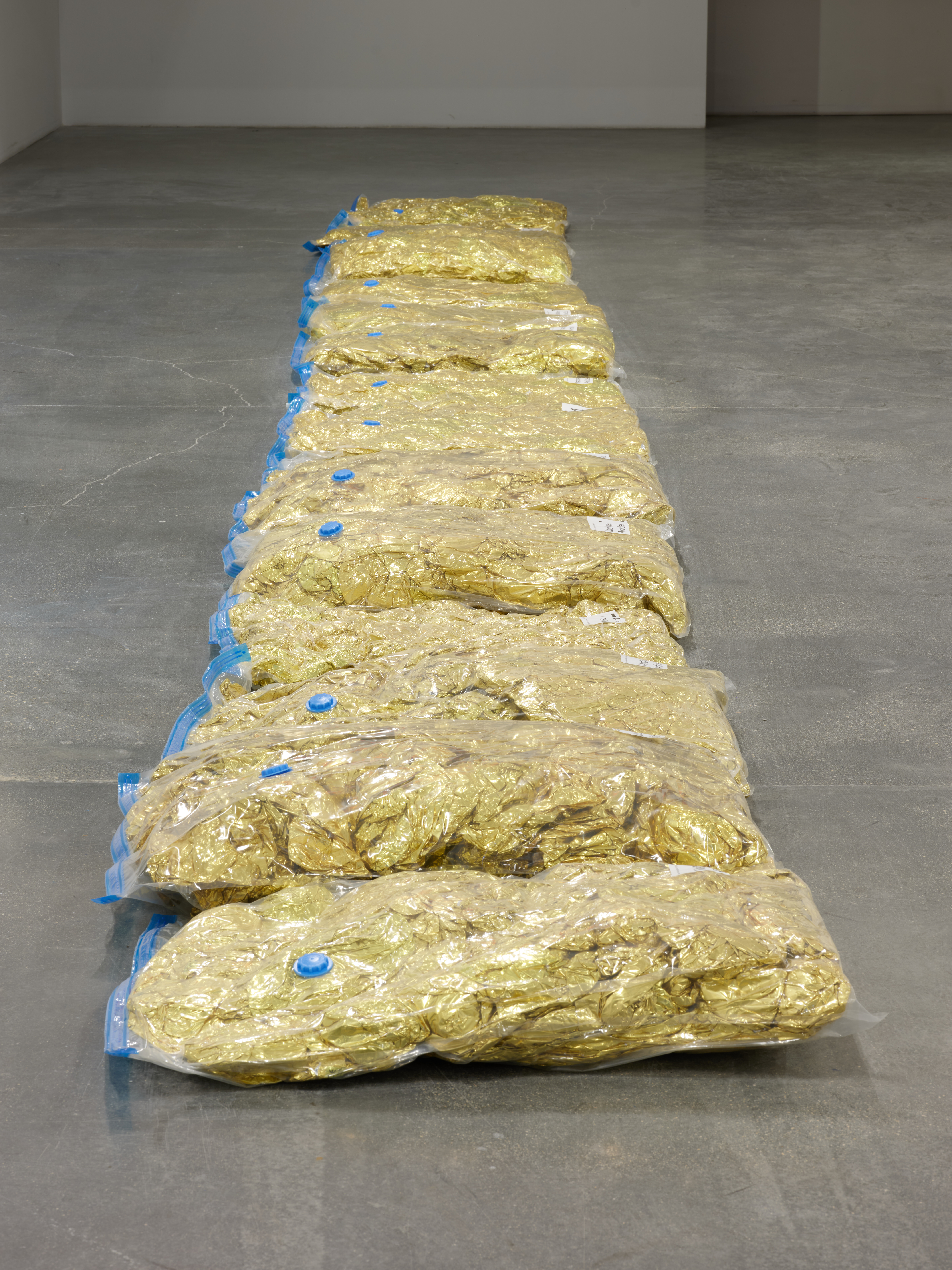 Sergide yer alan ‘right?’ serisi ise, İnsan Hakları Evrensel Bildirgesi’nin maddelerinden oluşan balon harflerin bu kez sönmüş, vakumlanmış halleriyle sunuluyor. Bir zamanlar parlak ve dikkat çekici olan harfler, hurçların içinde sıkışmış durumda. Bu yerleştirme, evrensel hak söyleminin güncel bağlamda etkisini yitirdiğini ima eden sessiz bir görüntü oluşturuyor.
