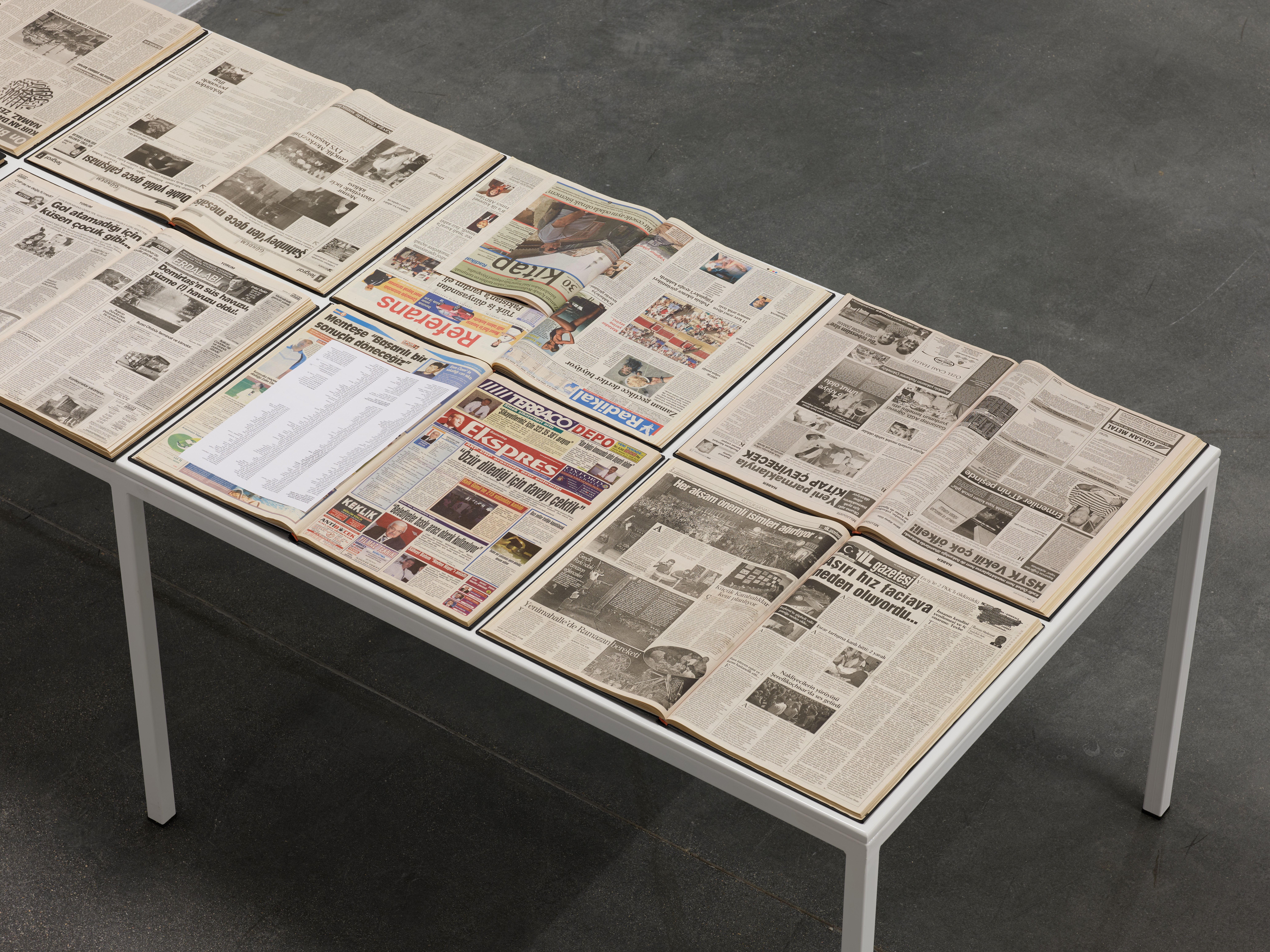 Cennetoğlu’nun uzun soluklu işlerinden ‘20.08.2010’ da sergide yer alıyor. Türkiye’de o gün yayımlanan ulusal ve yerel gazetelerin ciltler halinde yan yana getirilmesiyle oluşan bu çalışma, gündelik haber akışının nasıl bir kolektif hafıza inşa ettiğini hatırlatıyor.