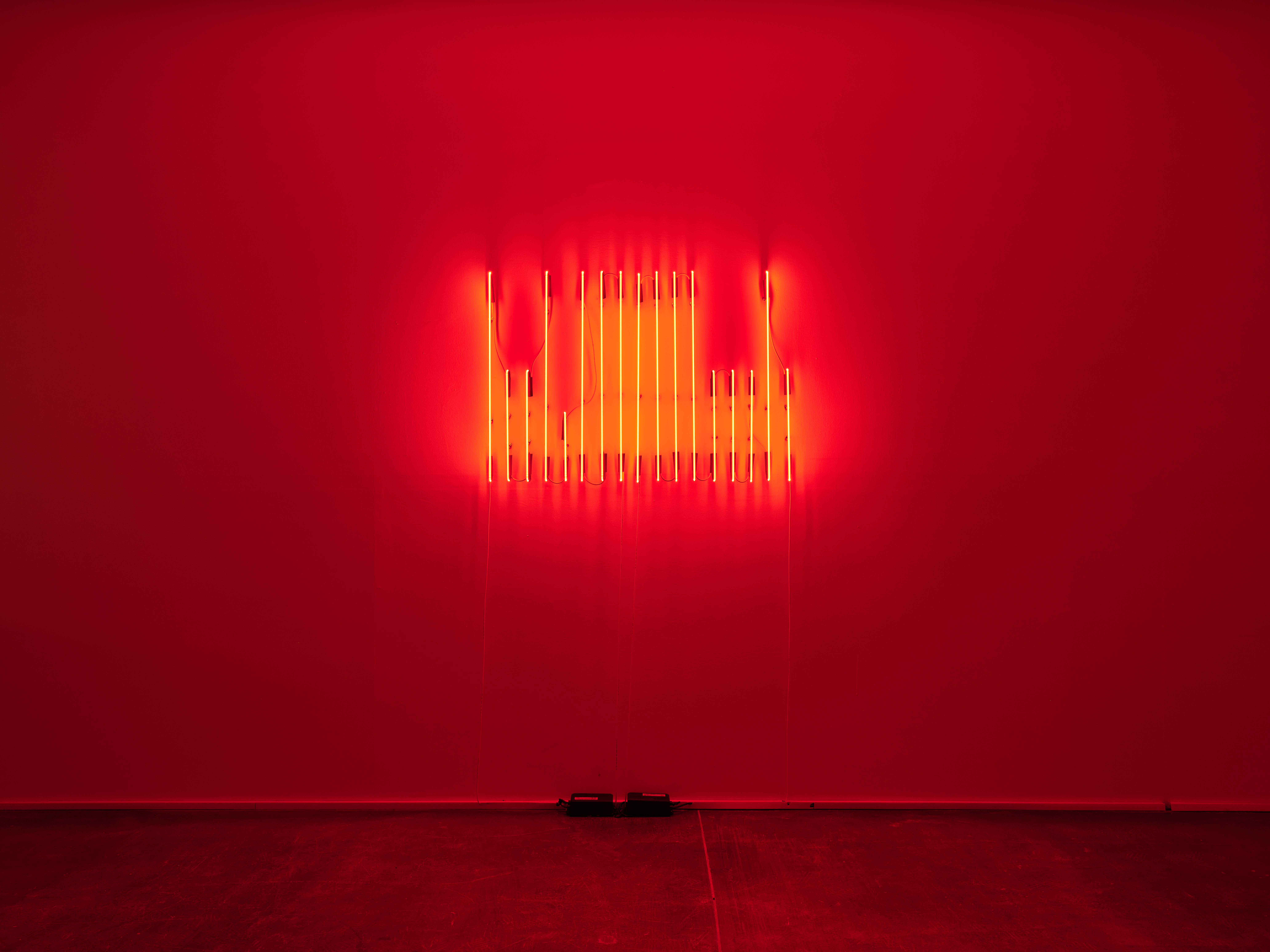 Serginin mekânsal etkisi en belirgin işlerinden biri olan ‘CİNNET’, neon kırmızısı ışığıyla ara katlardan ana sergi alanına doğru yayılıyor. Daha önce ‘CENNET/CİNNET’ ikiliğiyle karşımıza çıkan bu yerleştirme, bu kez tek bir kelimeyle verilmiş.
