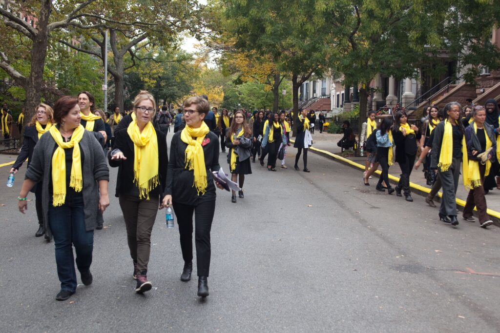 “Kadrajın arka planındaki ‘Kız Kardeşlerimizin Anısına-Kadınlar Karşı Koyuyor’ yazılı bir pankart gösterinin politik niteliğine dair ipucu veriyordu ama toplanma biçimine bakılırsa estetik bir kaygı da barizdi. Tepeden tırnağa siyahlara bürünmüş ama boyları gerçek olamayacak kadar uzun dokuz kişi, ellerinde kırmızı kumaşlarla bir koro sırasında gibi dizilmişti. Hem toplumsal bir protesto hem sanat yapıtı olarak tasarlandığı için böyle bir ‘gösteriselliğin’ amaçlandığını sonradan öğrendim.”